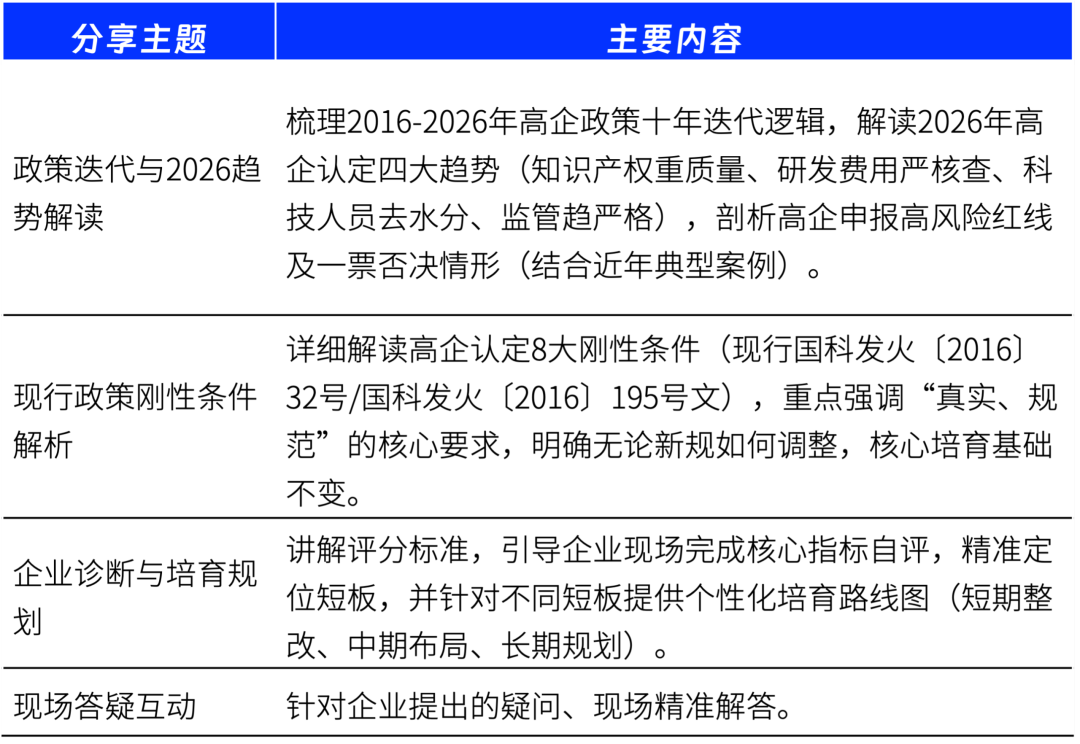 当前,我省2026年高新技术企业(以下简称“高企”)认定申报通知及政策依据尚未发布,但通过相关渠道释放的政策信号及历年修订逻辑综合研判,高企认定已明显呈现“提质、严审、重实、强链”的发展趋势。为帮助企业提前布局高企申报工作,精准把握现行政策核心要点、预判政策修订趋势,厘清申报“变”与“不变”的关键边界,规避申报风险,夯实申报基础,广州市高新技术企业协会拟举办“2026年度高企认定申报要点解析与合规培育提质增效活动”,现将具体事宜通知如下: